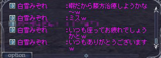 | D | [bi_up2705.jpg] | 夜帝の商売シャウトと自慢もどきの誤爆 | 28kB | 2009/03/05(Thu)20:52 | ハンターの宿.JPG |