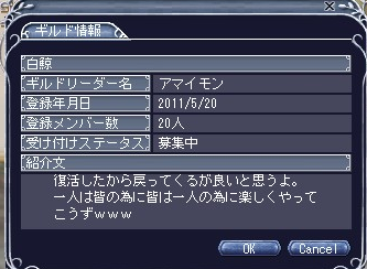 | D | [bi_up3376.jpg] | 相変わらずの出会い厨ギルド白鯨 | 18kB | 2011/04/09(Sat)17:46 | 魔王リョージ.JPG |